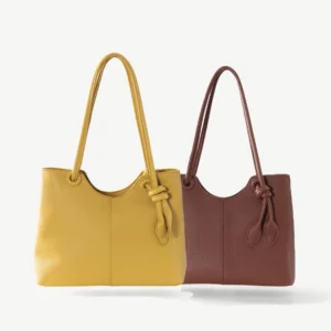 External Features: Pebble PU fabric Tube shoulder handles, forming knotted leaf design on one side. Centre seam detail front and back and scooped top feature. PU covered eyelets where handles join the bag.