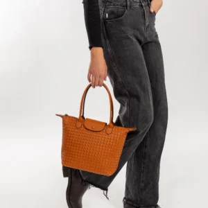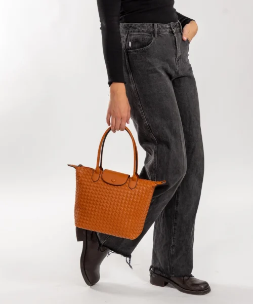 External Features: The bag is totally woven both front and back. the shoulder handles are sewn to the front of the bag. A matching zip across the top is open and closed with a double zip puller.