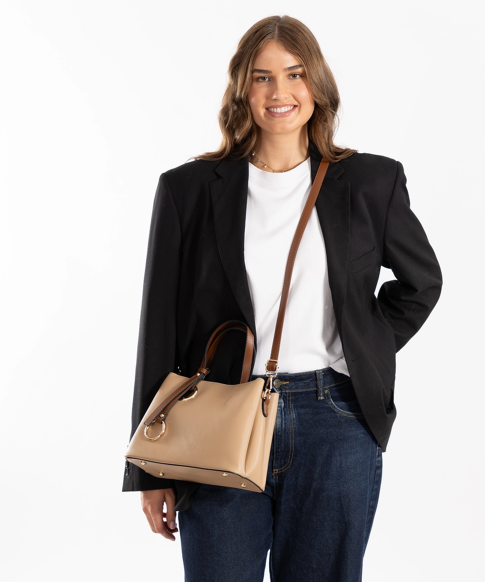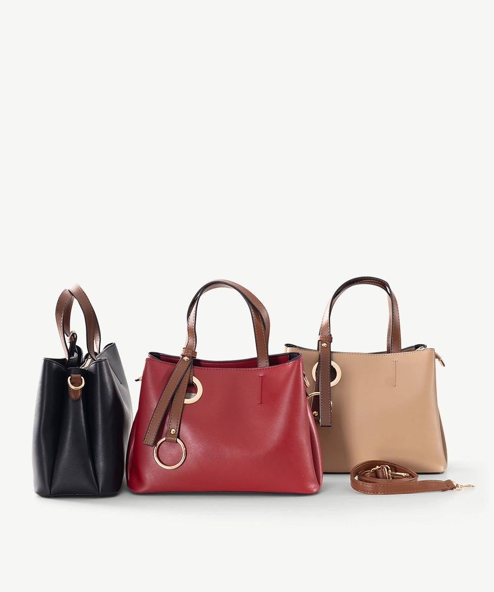 External Features: The overall look is of elegance with soft gold hardware. The grab handle features an extension on one side, ending in a gold- coloured ring. The front of the bag also mimics the gold-coloured large eyelet.