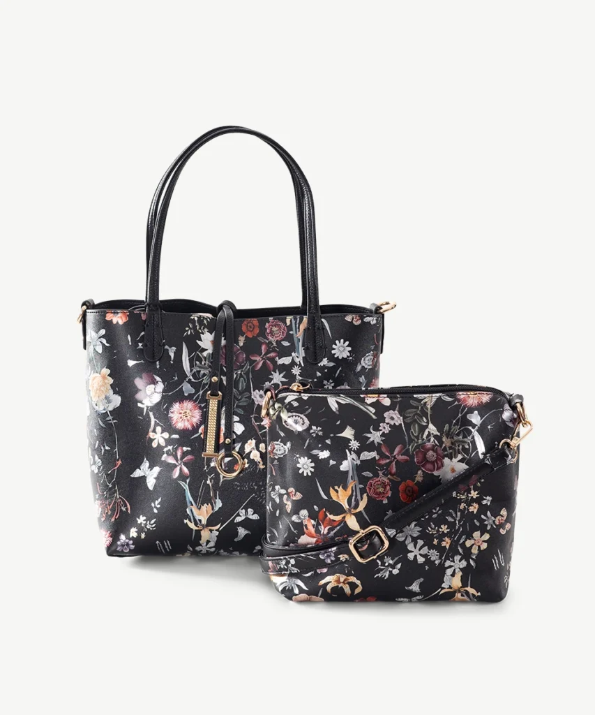 External Features: Soft floral fabric lifted with metallic highlights. Crossbody strap can also be used on the handbag. Handles are self-coloured in pebble finish PU.