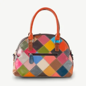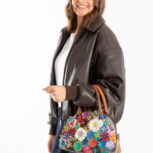 External Features: Front encrusted with multicolour leather flowers, each with central silver studs. Back is multicolour diamond leather patchwork. Zip pocket on back. All silver hardware