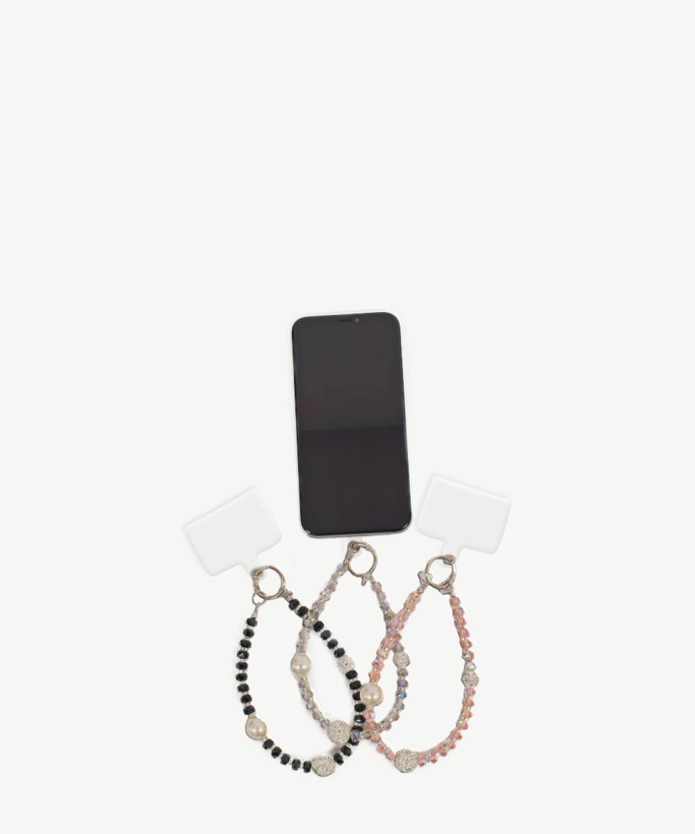 A bright, eye-catching phone wristlet that adds a touch of sparkle to your phone while keeping it close at hand (makes it much easier to find in your handbag!). Made with a mix of crystals, faux pearls, and diamantés.