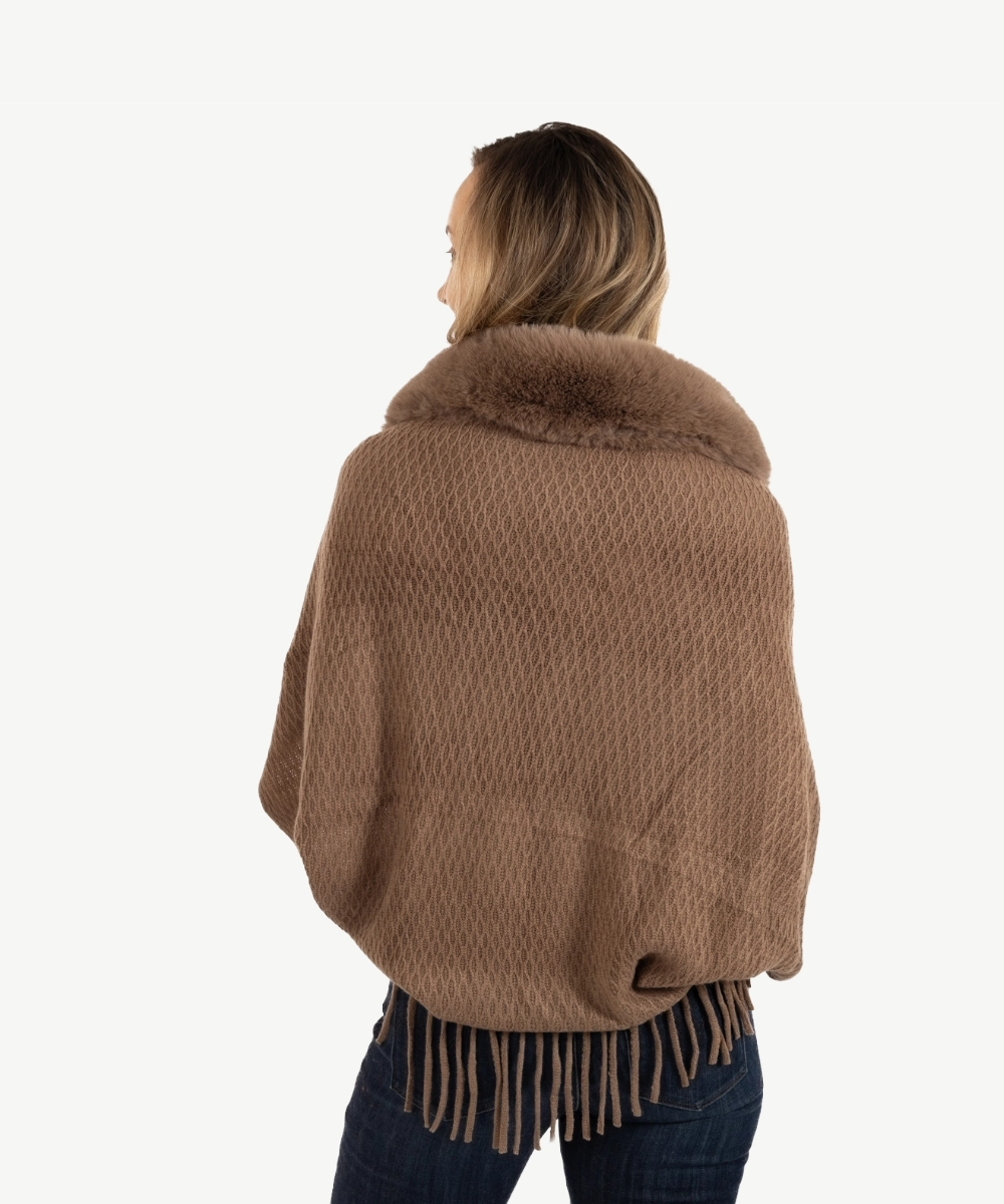 Material: Acrylic knitted fibre on body. Faux fur around the neck and down the front of wrap/shrug.