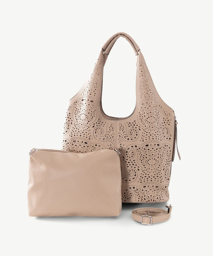 External Features: The front and back of the bag is totally covered in laser cut. The paisley laser pattern is featured up to the handles. The handles are also reinforced.