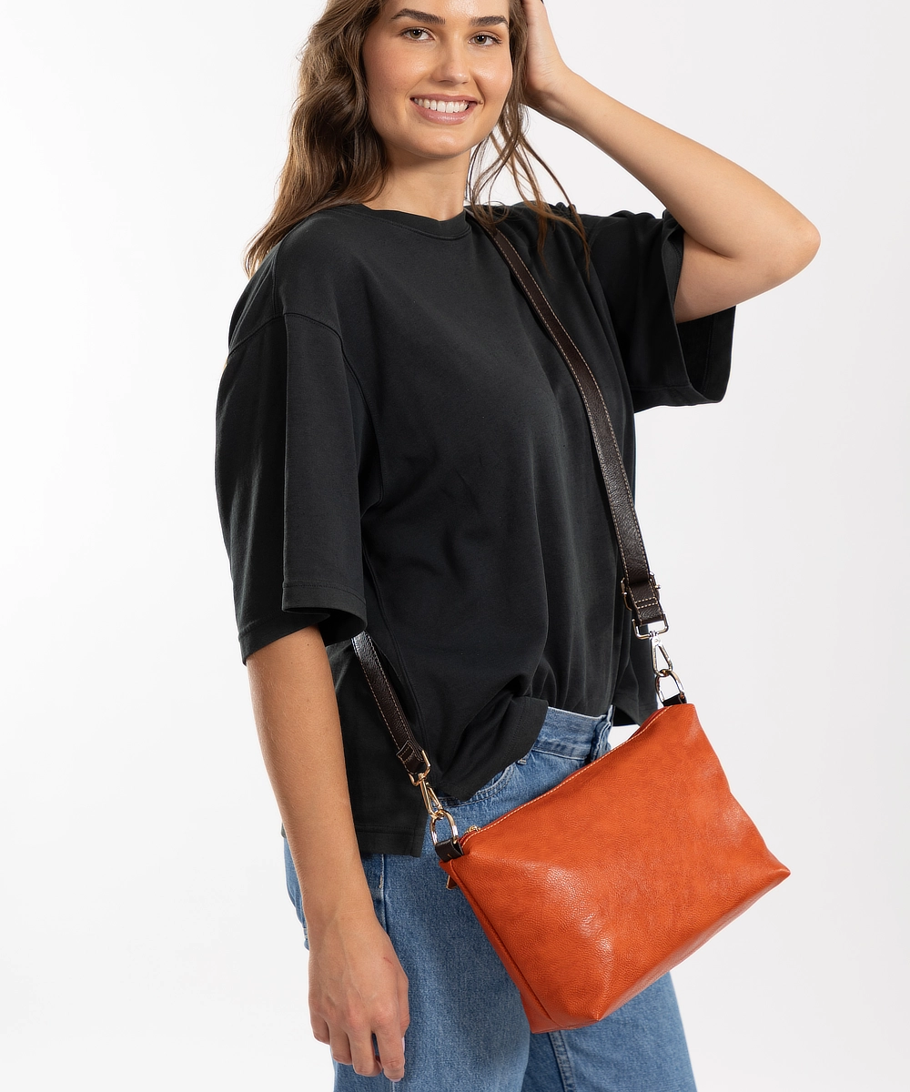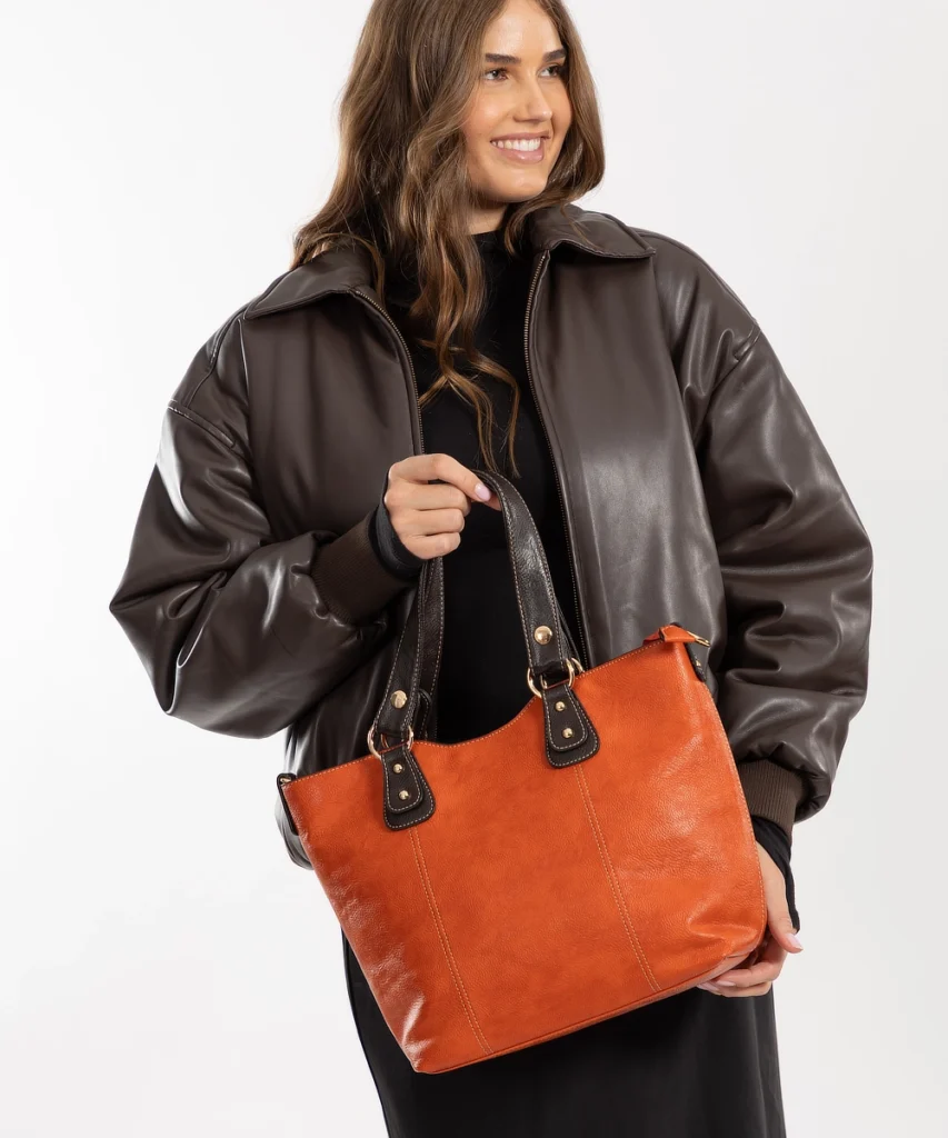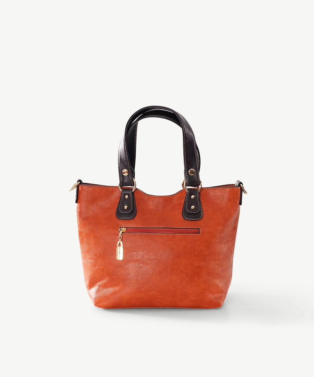External Features: Generous 3cm wide dark chocolate handles end in double flaps secured by a gold rivet. Cream highlight stitching is featured on all edges. Down the front of the bag twin stitch lines run to the base. The back of the large bag features a zip pocket. Gold hardware used throughout.