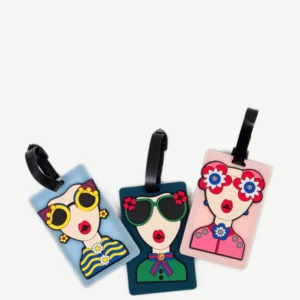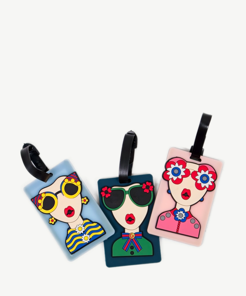 Front: Each tag features a whimsical female face with glasses. Stylish clothing in the form of a prim shirt secured with a bow or stylised button. Lovely to hold