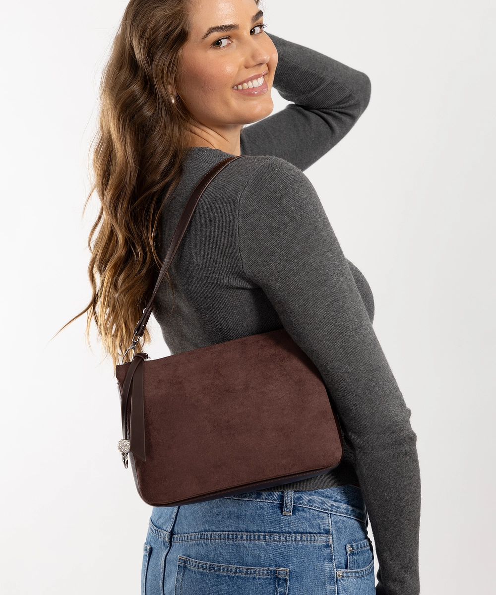 External Features: All hardware in silver including domed rivets on shoulder strap. Front and back of bag is featured in velour. Sides of bag and straps and zip puller are matched in PU. Back zip pocket with ornate coloured puller.